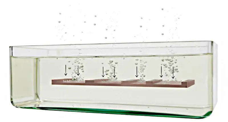 Aus einem isolierten Starkstromkabel biegen Sie leicht einen Haltebügel für die Platte zurecht. Damit können Sie die Platte gefahrlos in die Ätze tauchen und dort bewegen. Einen Drahtrest erhalten Sie billig oder kostenlos beim Elektroinstallateur oder vom Recyclinghof. Am stabilsten ist ein gelb-grünes Nullleiterkabel, mit dem die Wasserleitung geerdet wird. Nach dem Ätzen und Wässern bürsten Sie mit einer weichen Bürste die Ätzrückstände aus der noch feuchten Platte heraus.